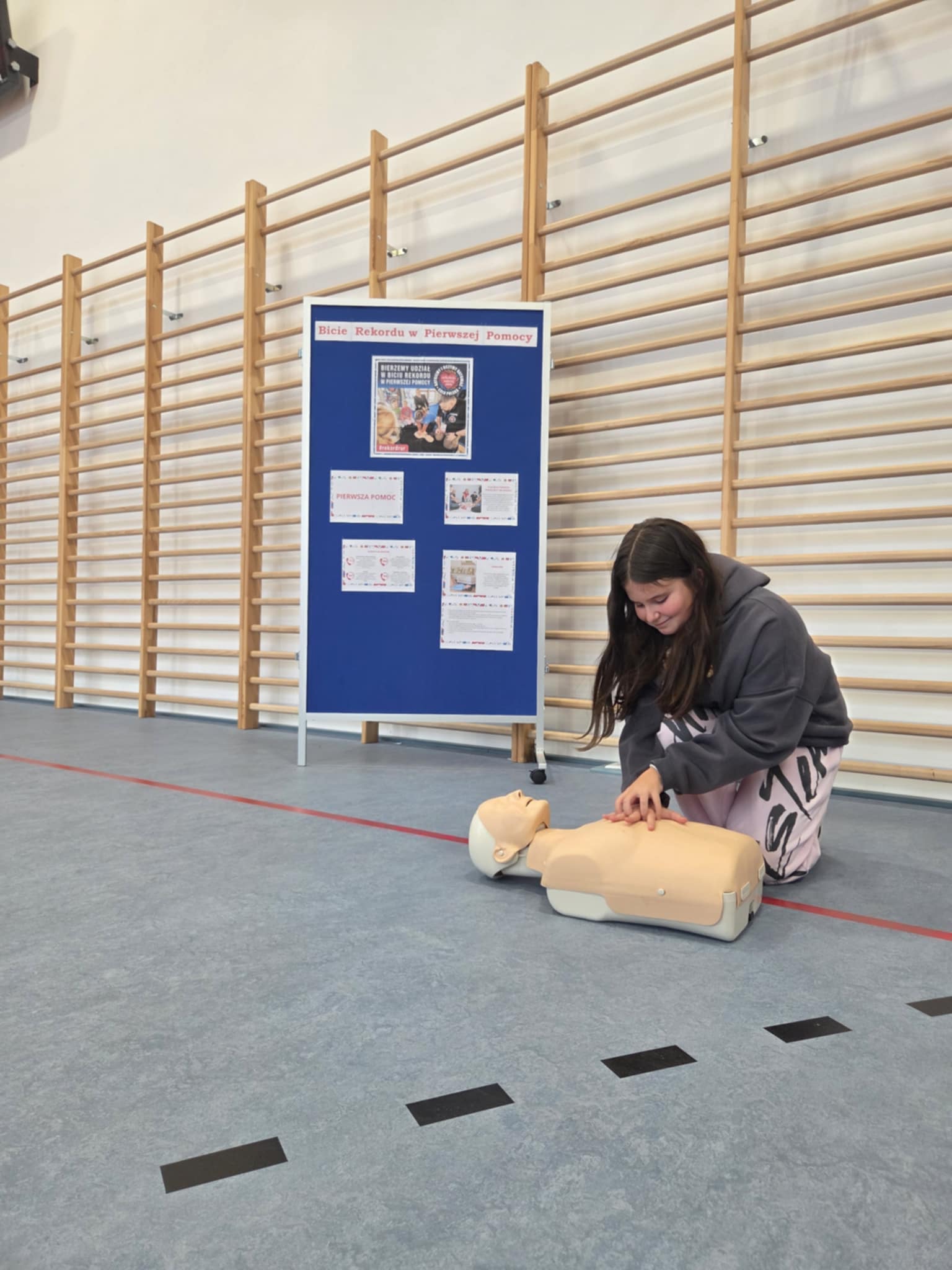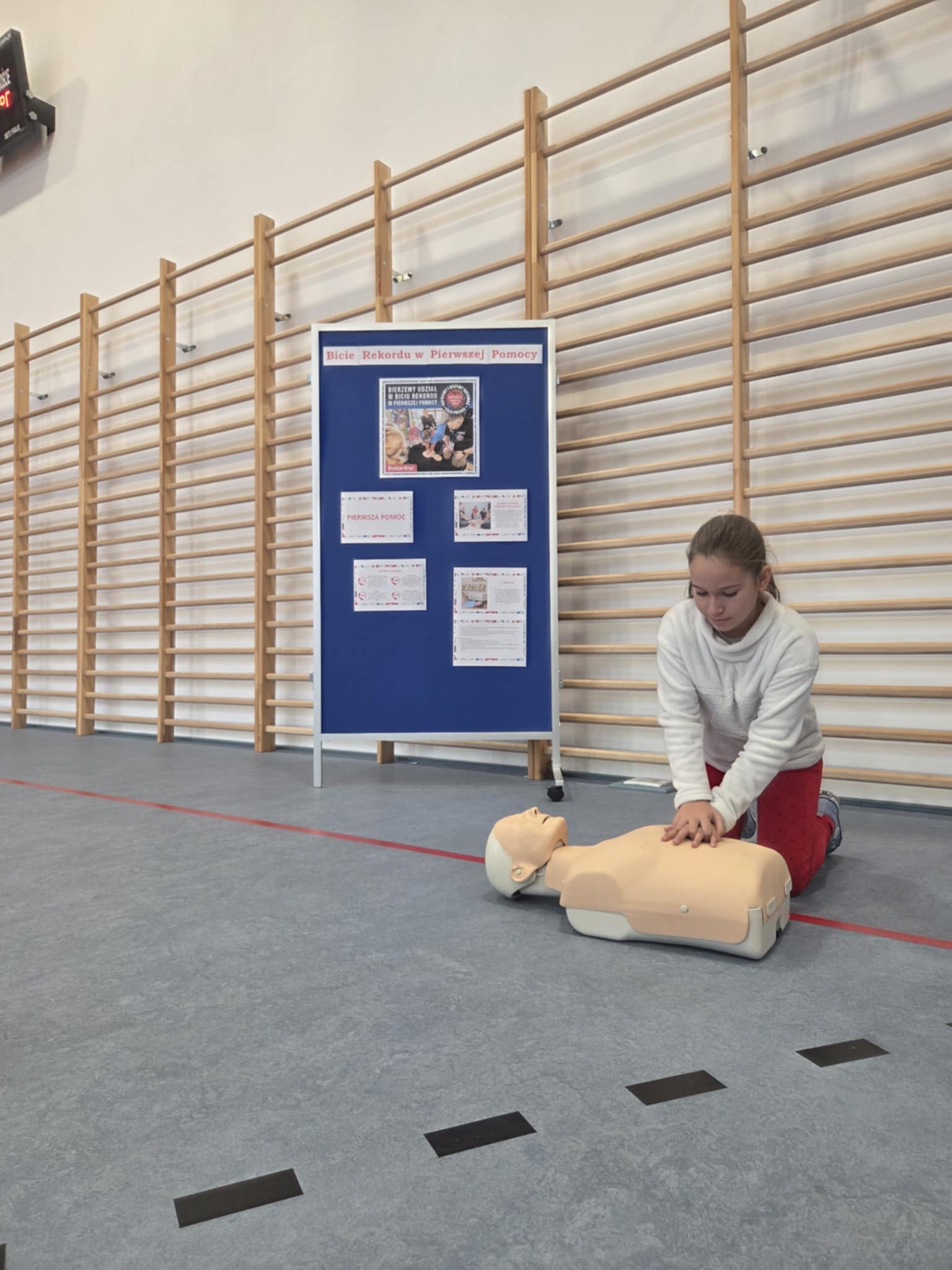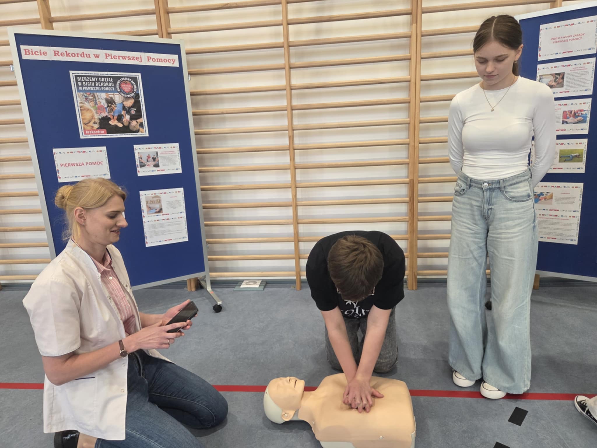 Pierwsza pomoc to ważna umiejętność, która może uratować życie drugiego człowieka. Do bicia rekordu przystąpiło 20 uczniów z klas IV-VIII. Razem z dziećmi i młodzieżą z całej Polski, nieprzerwanie prowadzili resuscytację krążeniowo-oddechową.