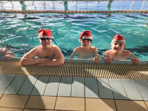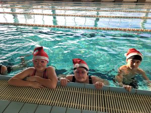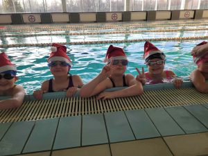 Uczniowie klas II i III wzięli dziś udział w wyjątkowych, świątecznych zajęciach na basenie. W ramach projektu „ABC Pływania” dzieci doskonaliły swoje umiejętności pływackie, a wszystko odbywało się w radosnej atmosferze – w czapkach Mikołaja, które dodały treningowi szczególnego, świątecznego charakteru. Z entuzjazmem wykonywały kolejne zadania, ucząc się poprzez zabawę i aktywnie spędzając czas.