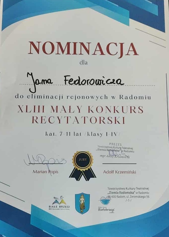 Uczeń z klasy III – Jan Fedorowicz  – otrzymał nominację do kolejnego etapu XLIII Małego Konkursu Recytatorskiego.
