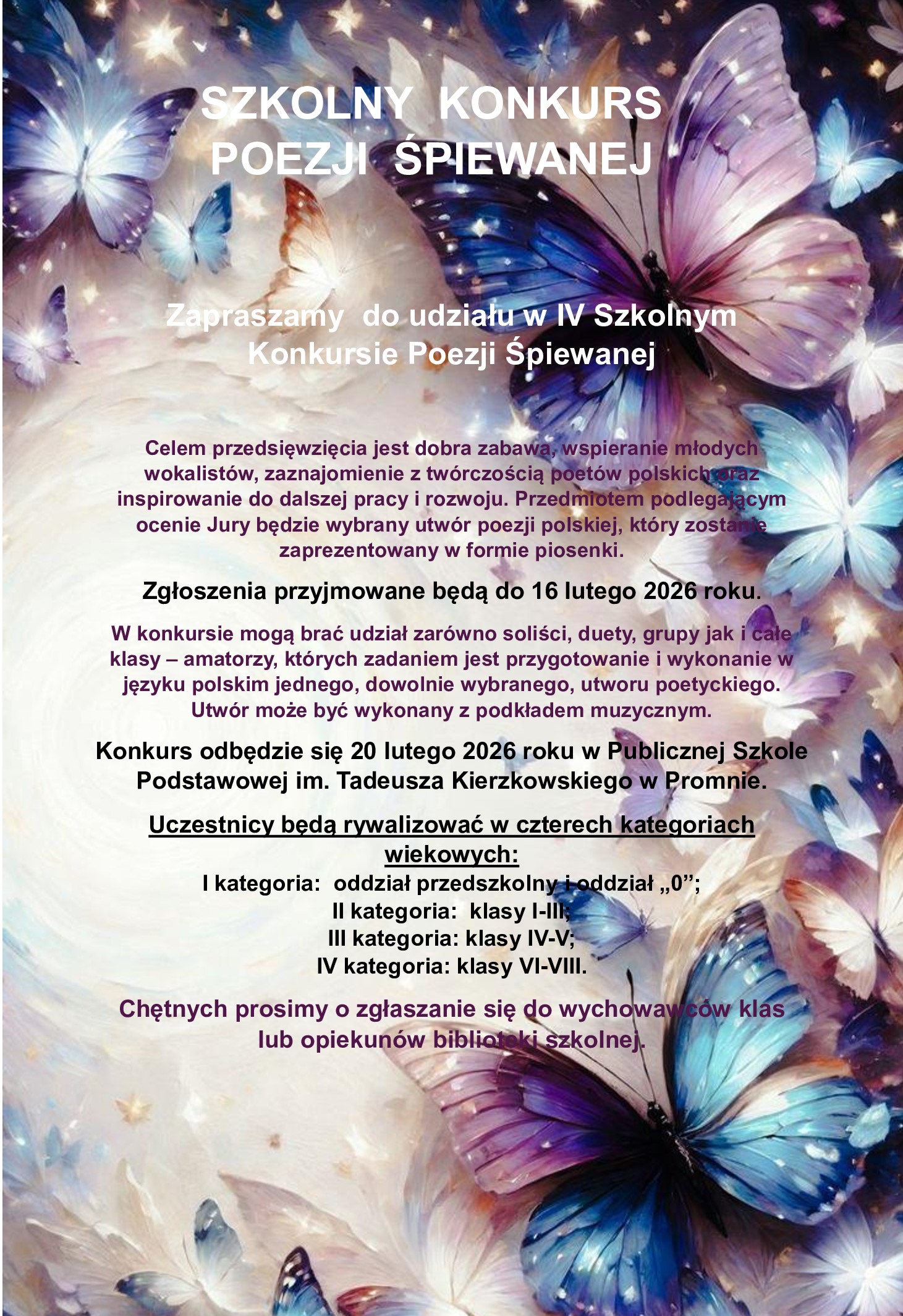 Konkurs jest zorganizowany przez bibliotekę szkolną w PSP im. Tadeusza Kierzkowskiego w Promnie.